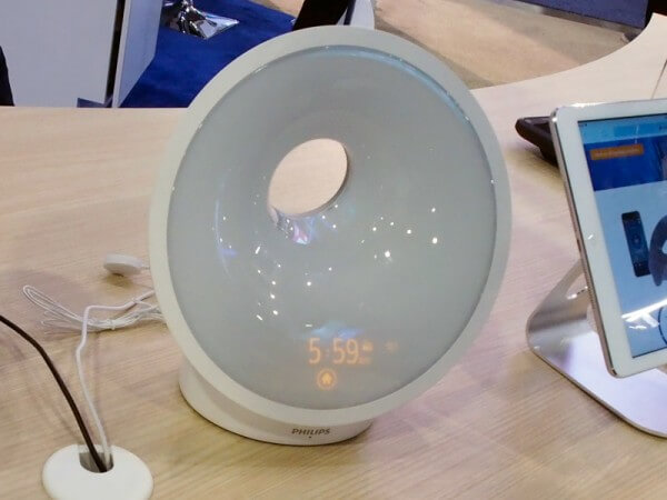 フィリップスは合わせて「Somneo」というスマートライトを出展していた。こちらは曲線で構成されたライトで、ベッドサイドに置き目覚めと睡眠を促進してくれるという。光は太陽の日の出、日の入りの明かりプログラムされているため、目覚め時間には日の出を、睡眠に入るときは日の入りの光が点灯する。自然の太陽と同じ光を浴びることで、目覚めがよく、また睡眠への入りも促進されるという。