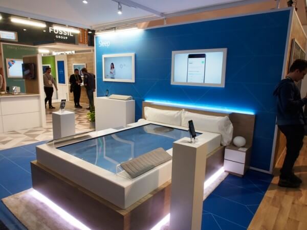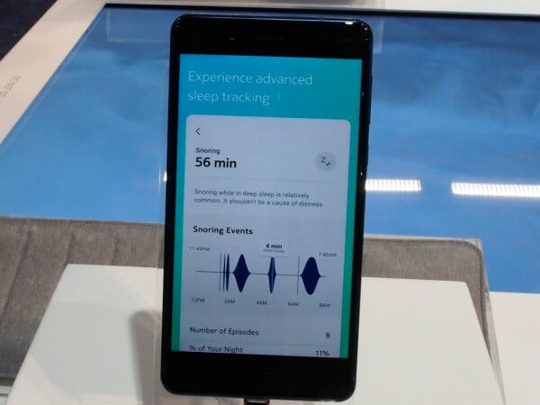 一方、ノキアはベッドの下に敷くマット型のデバイス「Nokia Sleep」を出展。スマートウォッチの睡眠検出機能が腕の動きをトラッキングするのに対し、Nokia Sleepは布団の下に敷くことで、布団の上に寝る人間の細かい動きをモニタリングする。具体的には身体の左右の動き(寝返り)や息遣い、そしていびきまでも検知できる。また心拍数の自動測定にも対応している。