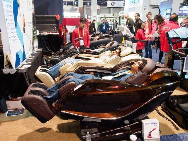 CES2018会場には他にもマッサージチェアの展示も多く見られた。スマートフォンと接続しマッサージプログラムをワンタッチで起動したり、ヘッドフォンから流す音楽を設定できるなど、単体のマッサージチェアよりも高度なことができるものが目立った。CESの会期初日には立ち寄る客の数も少なかったが、最終日はどこのマッサージチェアも満員。来場者もそれだけ疲れているということだろう。