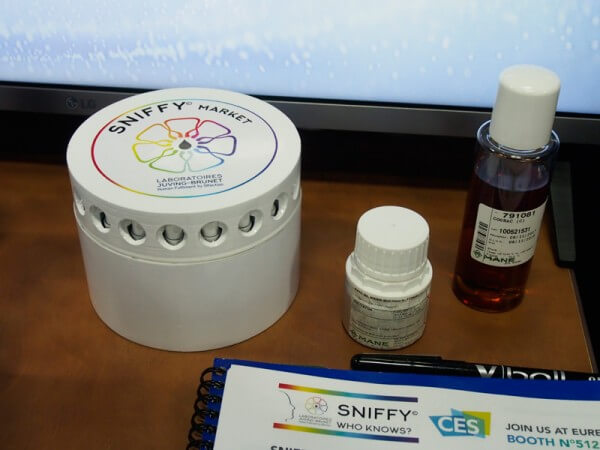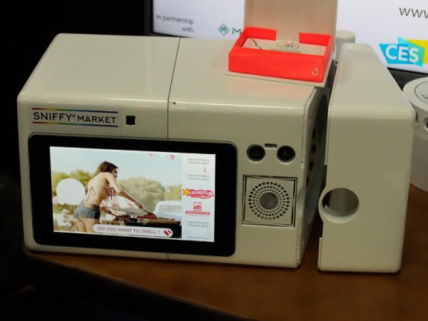 フランスのSniffy Marketは、香りや匂いも体験できるIoT製品をCES2018に参考出展していた。本体は電子レンジ程度の大きさで、そこに広告を表示するディスプレイが埋め込まれている。本体内には香りのエキスを収納するカプセルがあり、広告に合わせた香りが端末から出てくるという仕組みだ。