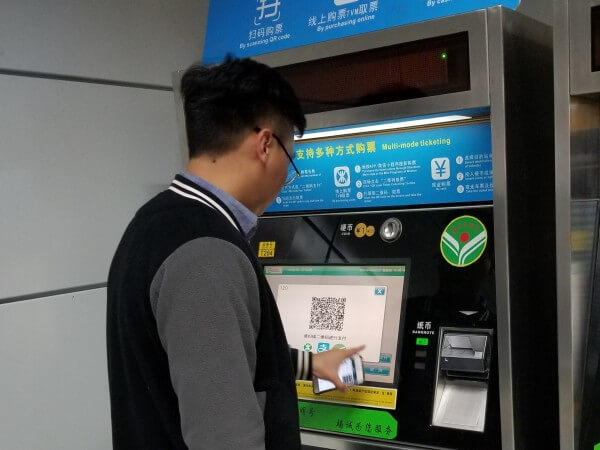 例えば深センの地下鉄に乗ろうとすると、切符の自動販売機の一台だけに行列ができている。その自販機はモバイルペイメントで切符が買えるのだ。行き先を選べば自販機の画面にQRコードが表示されるので、スマートフォンで読み取って支払うことができるのである。