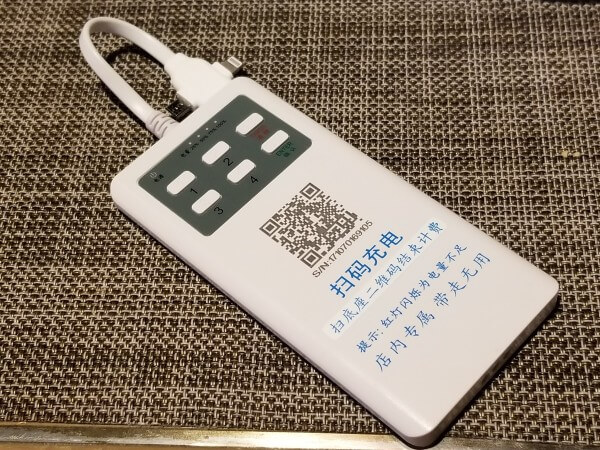 そのあと夕飯の時間になり、レストランに入ると空いている席に自由に座っていいという。席にはQRコードがあり、それをスマートフォンで読み取るとアプリが立ち上がり、注文画面となる。いくつか料理を注文すると、係員を呼ぶ必要もなく注文が通りあとは料理が自分の席に運ばれてくる。QRコードには席番号の情報も入っているのだ。ここでスマートフォンのバッテリーがだいぶ減ってきたので、店内にあるモバイルバッテリーのレンタル機からバッテリーを1つ借りる。これもスマートフォン支払いだ。