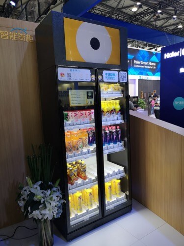 では中国のIT系展示会ではどのような無人店舗向けソリューションが展示されているのだろうか。2018年6月に上海で開催されたCES ASIA2018では家電メーカーやECサービス企業がこぞって無人店舗向け什器を展示していた。その中の1つ、もともとは家電量販店で今はECに注力しているSuningは、QRコード支払い対応のガラスショーケース型冷蔵庫を展示していた。